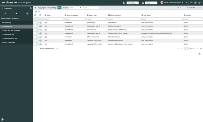 This opens a list of surveys that have been created in your ServiceNow. The list contains both currently active surveys and also surveys that are inactive.