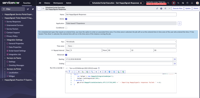 - Now, in your ServiceNow application navigator, find the HappySignals integration job under "HappySignals Ticket-Based IT Experience -> Integration Job".