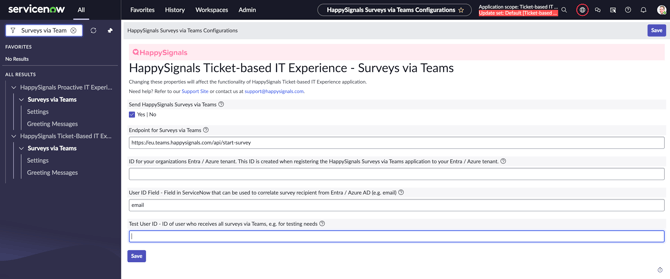 - Add the Pseudo Tenant ID shown when registering the Application to Entra to the corresponding field and set the "Send HappySignals Surveys via Teams" to "Yes"