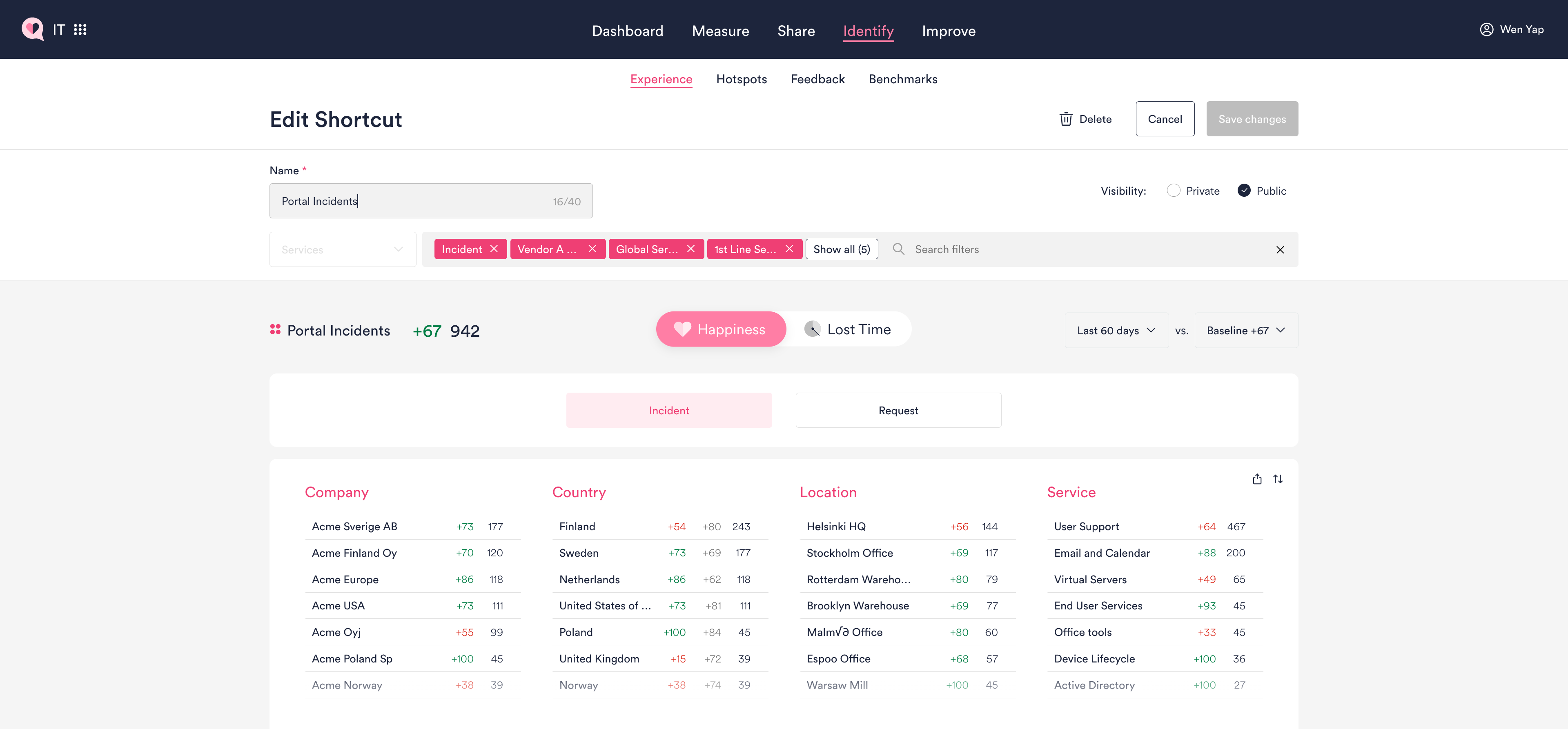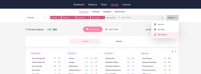 Shortcuts in HappySignals let you save and reuse the same set of data filters with one click. This article explains what Shortcuts are (and are not), where to find them, how to create, edit, share, and reuse them, and how permissions and visibility work.