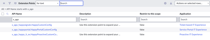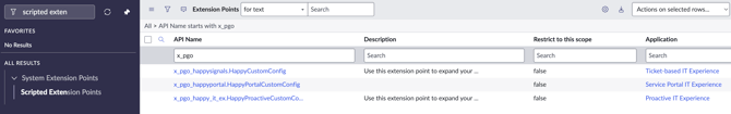 In the ServiceNow menu search for Scripted Extension Points then by filter with the API Name x_pgo you can find the HappySignals Extension Points.