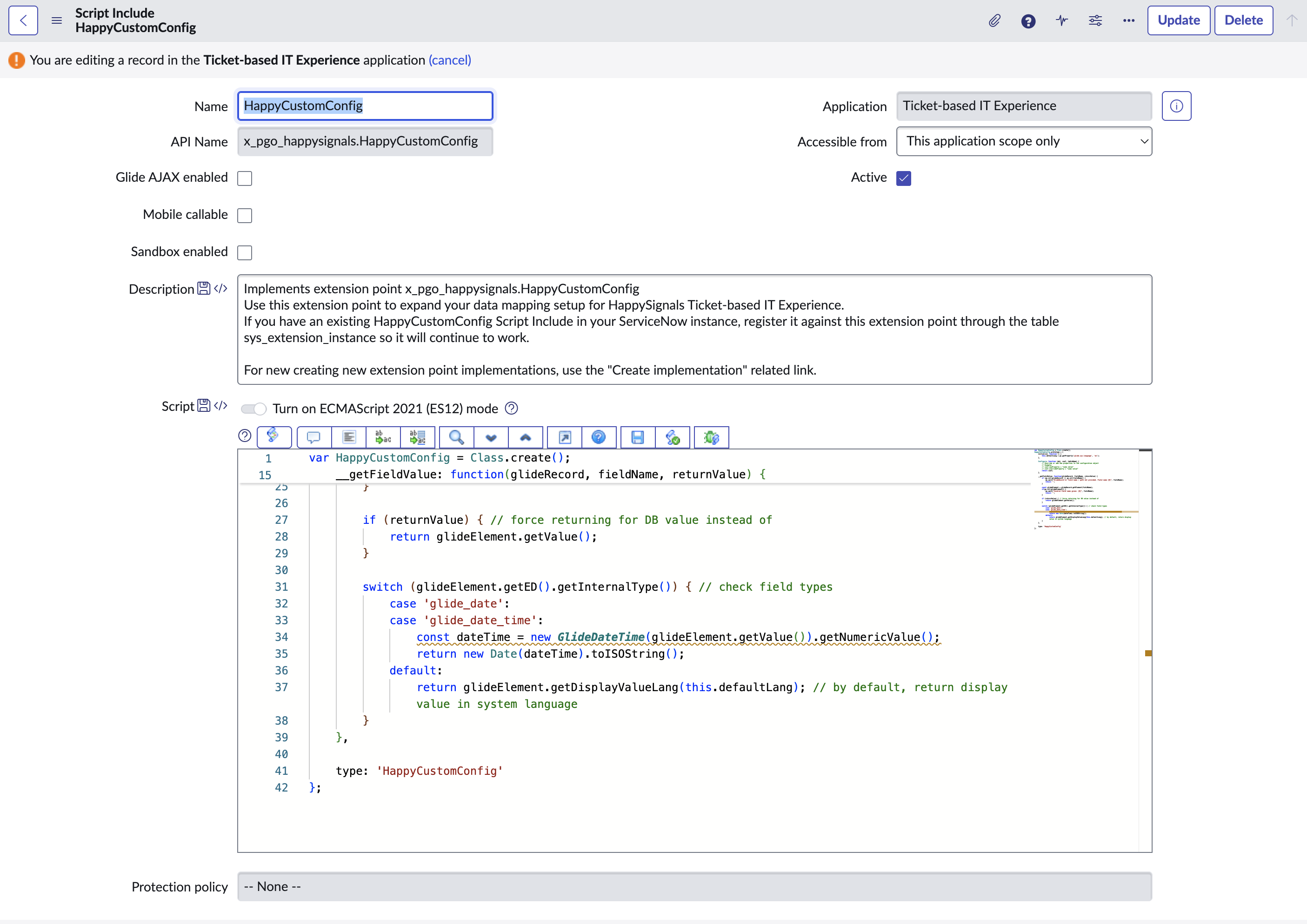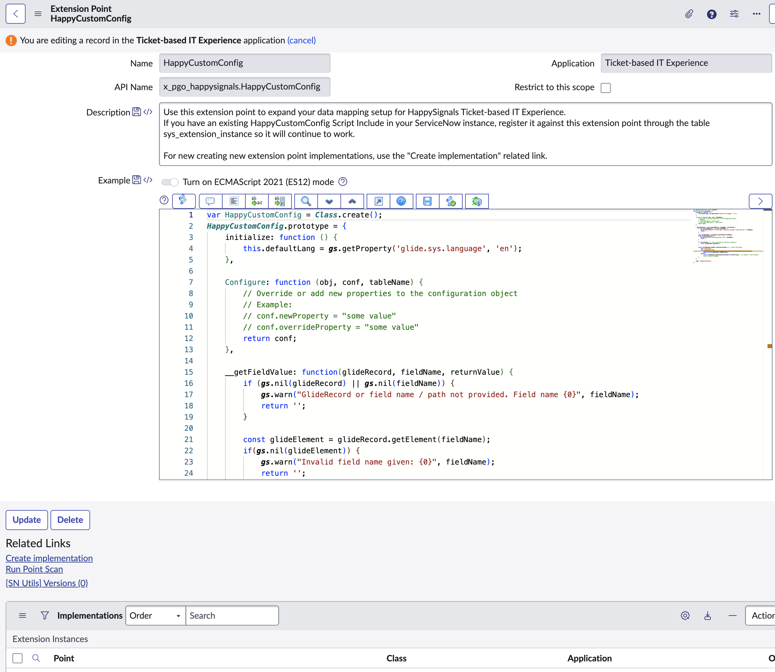 Due to changes made by ServiceNow, HappyCustomConfig script include needs to be linked to Scripted Extension Point starting from the application version 2.0.0 in Ticket-based and Proactive, version 1.2.0 in Portal Experience. If you are using a HappyCustomConfig you just need to link to the new Scripted Extension as an Extension instance, this can be done in sys_extension_instance table by creating a new instance and linking it to the x_pgo_happysignals.HappyCustomConfig that came with the update.